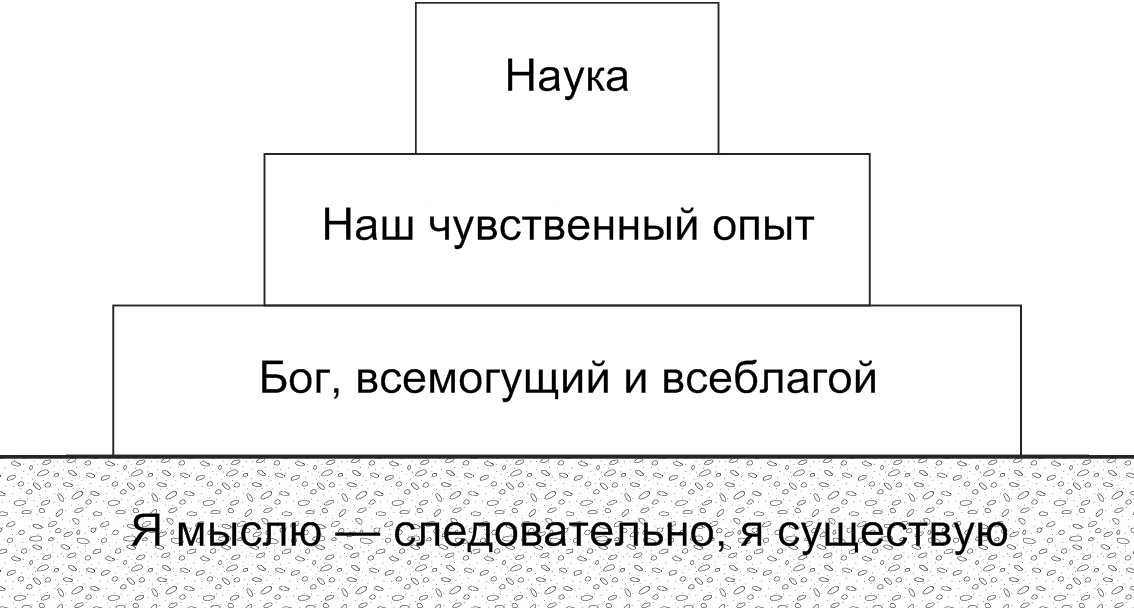Декарт искал «базис» для обоснованной веры. Благодаря такой поддержке вся структура прочно базируется на реальных основаниях. Философский фундаментализм — это поиск таких реальных оснований, на которых можно воздвигнуть «храм» знаний.