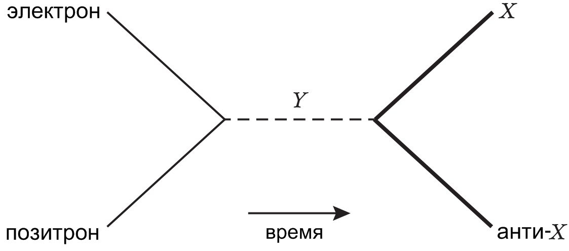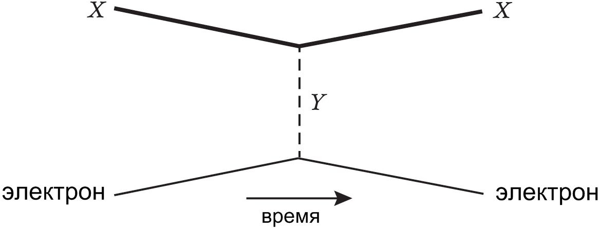 Взаимодействия между частицами в квантовой теории поля визуализируются при помощи прелестных картинок, которые называются диаграммами Фейнмана. Допустим, частица X отскакивает от электрона, при этом обмениваясь с ним какой-то новой частицей Y. Слева направо на диаграмме показано следующее: появляются X и электрон, обмениваются частицей Y и разлетаются своими дорогами.