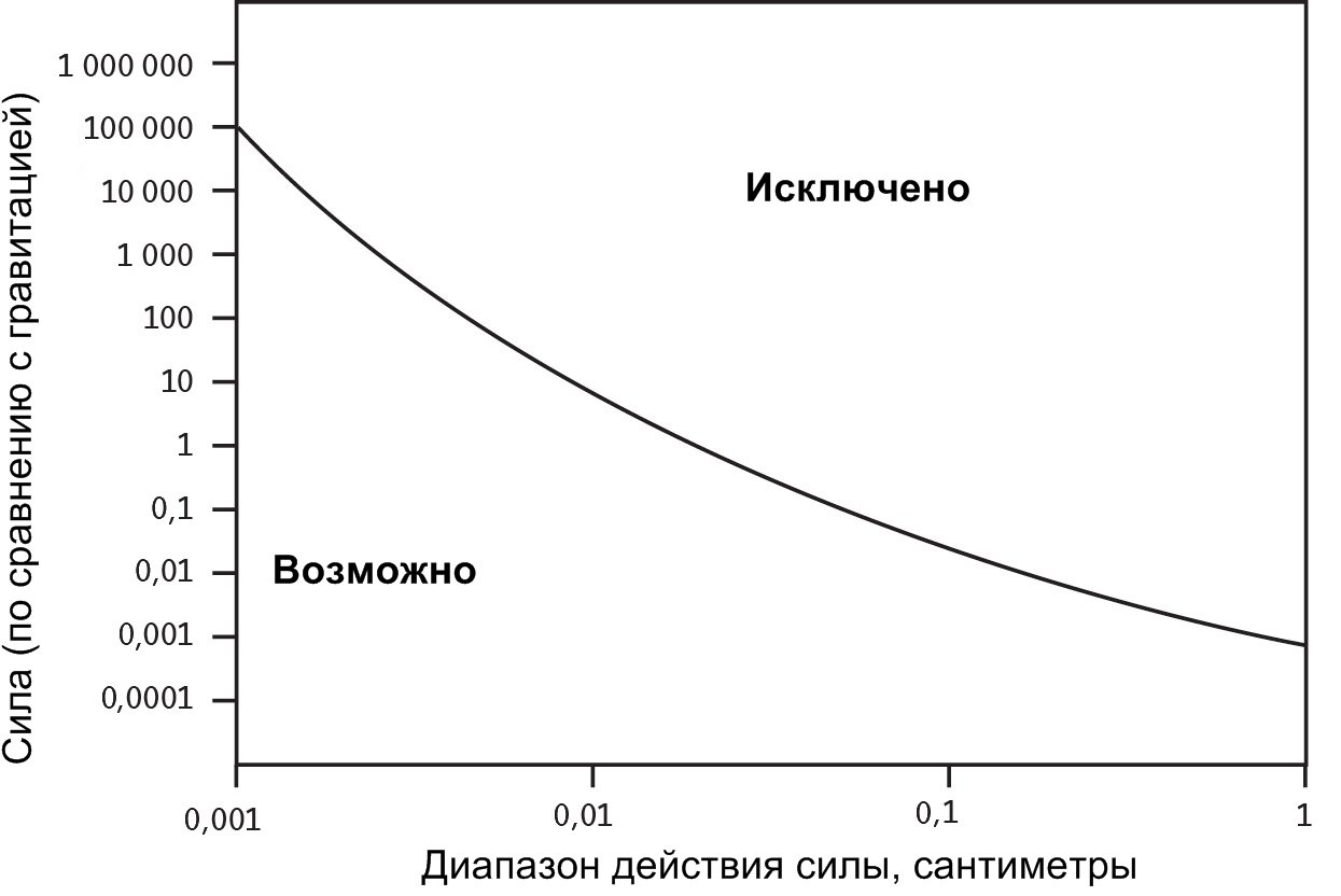 Таким образом, если диапазон действия новой силы составляет более одной десятой доли сантиметра — что было бы необходимым условием, если бы она позволяла гнуть ложки или была тем механизмом, который позволяет Сатурну влиять на вас в момент вашего рождения, — то была бы значительно слабее гравитации. На первый взгляд кажется, «не так уж и слабо», но не забывайте, что сила гравитации исчезающе мала. Всякий раз, когда вы подпрыгиваете, крошечные электромагнитные силы вашего тела позволяют ненадолго преодолеть суммарную гравитацию всей Земли. Столь слабое взаимодействие, как гравитация, — это сила, составляющая одну миллиардную миллиардной миллиардной миллиардной от силы электромагнетизма. Ещё более слабое взаимодействие должно быть полностью пренебрежимо в повседневных условиях.