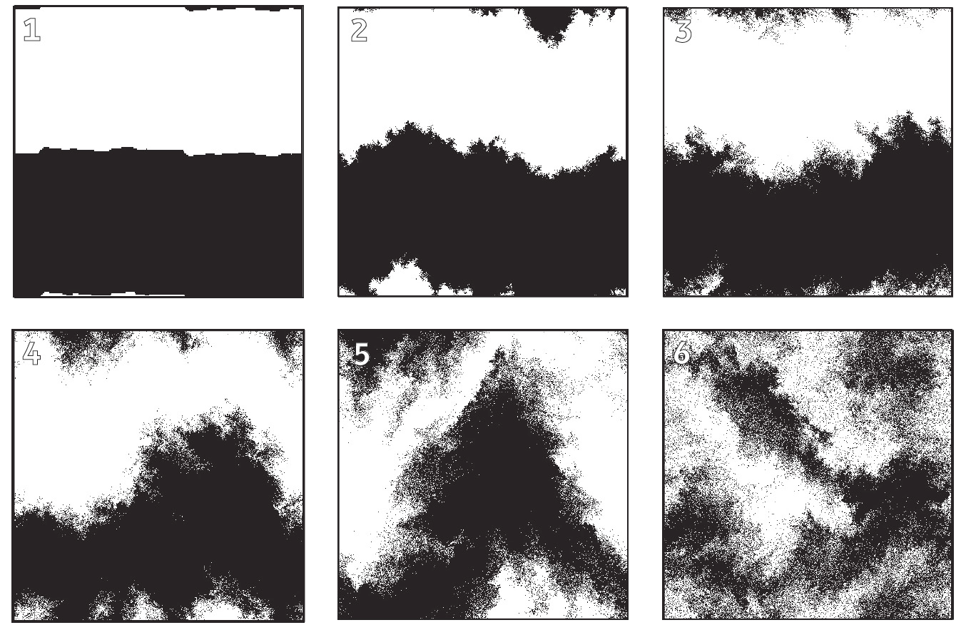Простая компьютерная модель, описывающая смешивание кофе и сливок. В самом начале конфигурация проста и постепенно усложняется. Дальнейшая эволюция вновь приведёт к её упрощению, поскольку тёмный и светлый компоненты полностью перемешаются