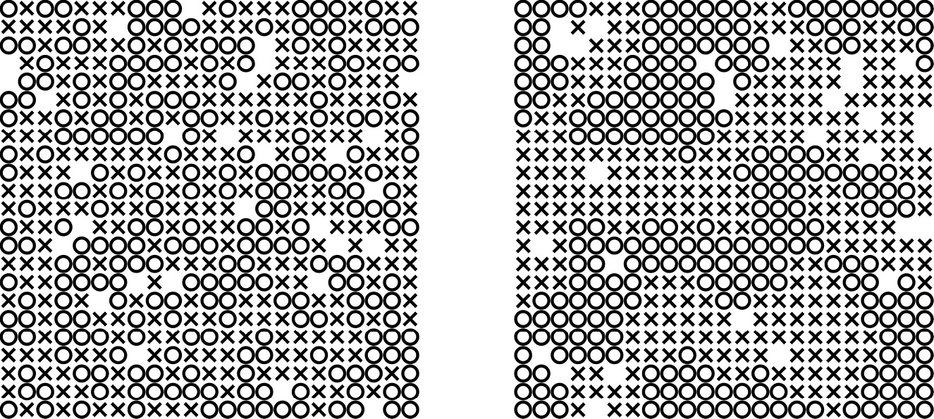 Конечно, нас бы не удивила существенная сегрегация, если бы символы проявляли полную нетерпимость друг к другу — если бы их напрягало, к примеру, соседство даже с двумя символами противоположного типа. Шеллинг показал, что даже небольшая степень предпочтения может породить масштабную сегрегацию. На рисунке показан пример с 500 символами, одна половина из которых крестики, а другая — нолики, причём они случайным образом распределены на сетке с небольшим числом пустых клеток. Допустим, символ чувствует себя неуютно, если 70% или более его соседей относятся к противоположному типу. Но это относительно терпимо. Нолик чувствует себя хорошо, если среди его восьми соседей ноликов не меньше, чем крестиков, и начинает расстраиваться, лишь если крестиков среди них оказывается шесть или более. В исходной конфигурации лишь 17% символов «несчастливы».
