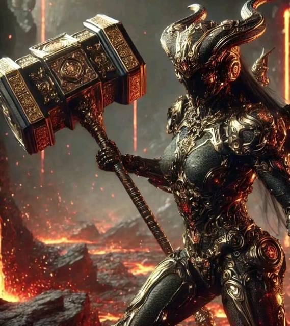 Обернувшись, увидел, что Клео, сменила наряд «Т-х» на рыцарские доспехи. Черно золотого цвета переливающихся на свету, выгодно подчеркивающих каждый изгиб ее фигуры. Доспехи имели множество мелких деталей. Смотрелись эпично. И прекраснее всего выглядели глаза, которые горели золотым огнем. А глаза зеркало души, видимо она очень близко к сердцу приняла обман существа. Странно, что у нее в руках, в место, какой-либо энергетической пушки, был, здоровенный молот.
