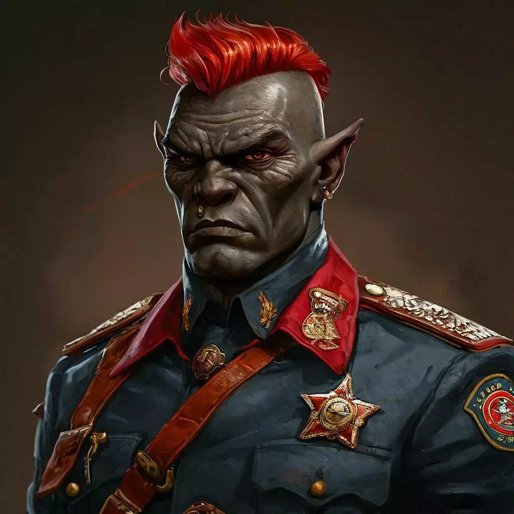 Низкий скошенный назад лоб, маленькие глазки под массивными безбровыми дугами, широкие скулы, толстые губы и торчащие снизу клыки! Не говоря уж про красные волосы и затянутое в милицейскую форму тело культуриста.