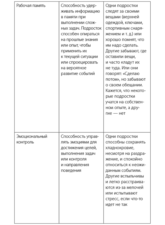 В таблице 1.1 перечислены исполнительные навыки в порядке их возникновения, даны определения каждого навыка и примеры того, как они проявляются у подростков.