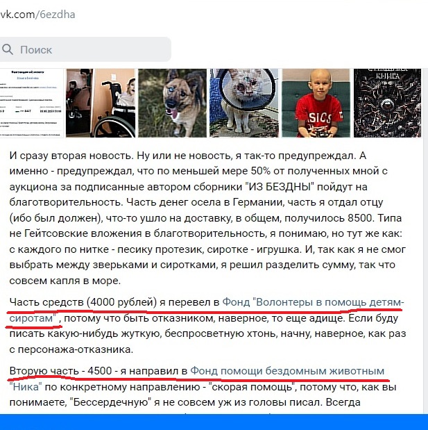 К слову, вслед за этим постом Германа, — главпарфёныш сам разродился лицемерным милосердием. На следующий день буквально! Пожертвовав Фонду 8 тысяч рублей. Но если Герман жертвует (я уверен) по совести, то Минькин ради себя, мотивы: от личного тщеславия — до личного пиара.