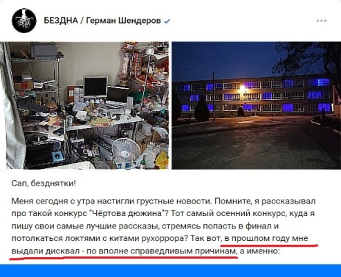 — Шендеров отправил кому-то из т.н. судей свой рассказ, который до лохоКонкурса никто не должен видеть в части авторства (по т.н. правилам). Но тусовка сатанистов/педофилов чудесным образом узнала, и говноед Подольский дисквалифицировал Германа из конкурсантов.