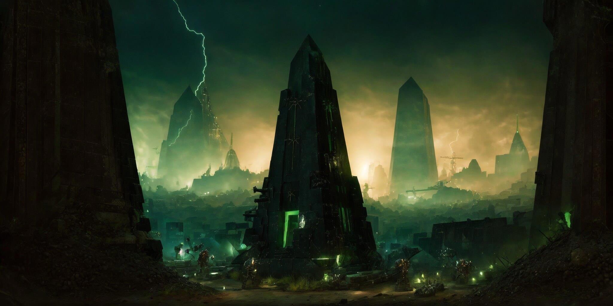 Стоило сделать очередной шаг по мёртвой песчаной тундре, как в глаза сразу же бросились далёкие изображения чёрных металлических пирамид и высоких монолитов, поблескивающих ядовито-ярким зелёным свечением. Воздух слегка дрожал возле них, пока небольшой гул возникал в голове, стоило только посмотреть на них.