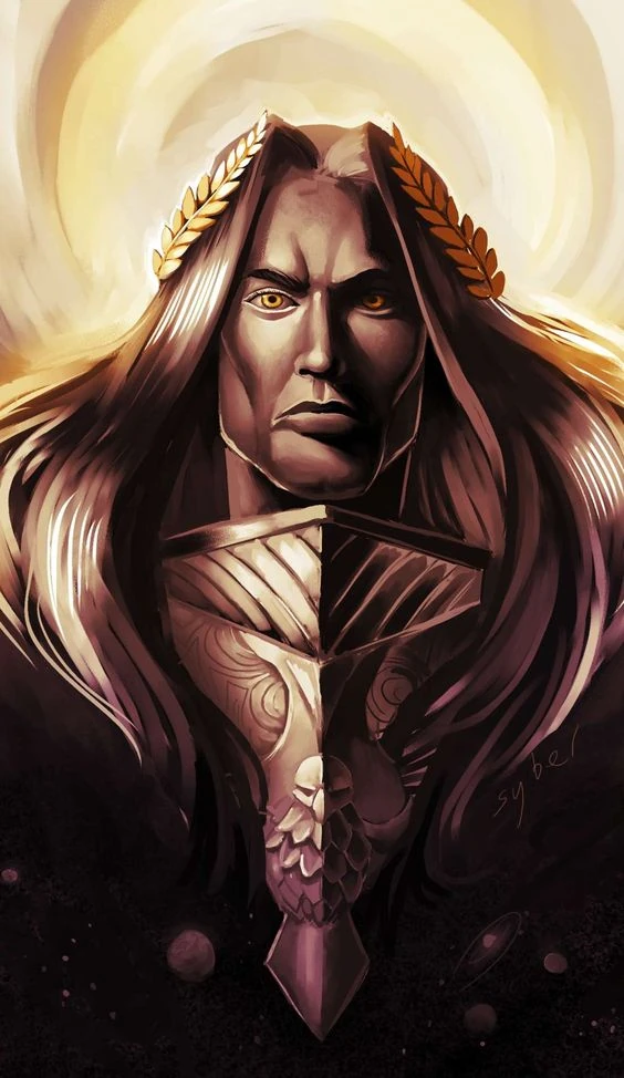 Очевидно, что его новая внешность также была искусственной, ибо никто из смертных не мог выглядеть так. Смуглая загорелая кожа, длинные чёрные волосы, удерживающиеся короной-венцом из золотых листьев и идеальные черты лица, словно бы вылепленные гениальным скульптором.