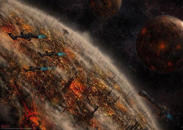Зета-тринадцать-си, вращавшаяся вокруг большой красной звезды, являлась довольно впечатляющим миром — даже с орбиты было видно, что вся его поверхность покрыта океанами стали и бесконечными заводами, возвышающими до самой стратосферы. Здесь не было видимых источников воды и остатков дикой жизни — лишь искусственные строения, созданные человеческой рукой. И это просто прекрасный показатель величия человеческого разума и желания упорядочивать дикий мир, пусть и не самый лицеприятный.