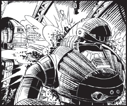 Расплавленная броня потекла на пол, а затем из пробоины полетели куски металла, когда гироскоп машины начало разрывать на части. Три ракеты, попавшие туда же, ускорили кончину машины, и «Аннигилятор» сначала упал на колени, а затем, медленно и почти грациозно, — на пол.