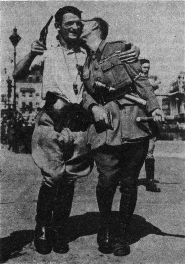 А где-то невдалеке от них, через линию фронта, стоял потрепанный в боях, погрузившийся в уныние и траур легион французских добровольцев… Освобождение Парижа для этих людей означало крушение последних ставок. Четыре года назад они сами оставили свою родину. Теперь лишились ее вовсе. Они догадались, почему на русской стороне фейерверк и поют «Марсельезу». Все, чем смогли они ответить, так это шальным, бессильным в злобе артобстрелом.
