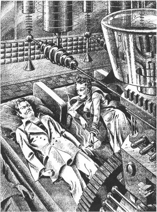 В каждой кабинке стоял роскошный, покрытый шелком диван, в стене у изголовья виднелся сложный механизм. Это и был проектор САН-лучей, заливавших мягким желтым светом лежавшие на диванах обмякшие фигуры.