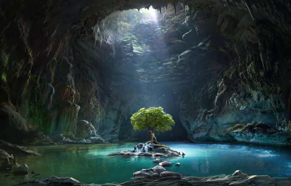 И опять их ждал неожиданный сюрприз, вместо ожидаемого выхода наружу они увидели большой просторный грот, по центру которого прямо на скальном выступе из воды росло красивое одинокое зеленое лиственное дерево, на которое сверху падал нежный солнечный свет. Хотя светило и не носило имя далекой звезды по имени Солнце.