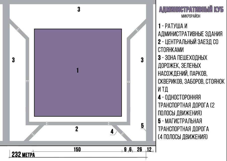 Пока что административный куб должен был быть окружен магистральными дорогами из четырех полос движения по всем четырем сторонам света. К самой ратуше были бы организованы отдельные подъездные двухполосные дороги с односторонним движением. Позже когда прогресс наконец-то дойдет до асфальтобетонных дорог все центральные магистральные дороги, возможно, будут переделаны в своеобразные авеню, по сути, отличие бы заключалось в центральной части с зеленными насаждениями и фонарными столбами пару метров в ширину, что ограждала бы собой полосы движения транспорта, а также украшало саму транспортную сеть. Для пешеходов эта зона бы служила временными островками безопасности. А сама дорога бы имела уже шесть полос движения в будущем, причем одна всегда была бы зарезервирована исключительно для общественного транспорта. Это была бы либо крайняя правая полоса, либо центральная в случае, если будет изобретено что-то вроде трамвая. Поэтому пока еще не слишком поздно зеленные и резервные зоны во всех магистралях без исключения было решено увеличить еще на два метра каждый, итого в сумме ширина центральных магистральных улиц была увеличена еще на восемь метров. Обычные улицы же остались прежними. Это было сделать не сложно, так как фактически был застроен лишь один жилой куб, остальные же спокойно можно было переместить, слегка переделив земельные участки. Лишь в одном случае пришлось переносить сооружение, так как оно располагалось впритык к резервной зоне, а это был склад, так что, не возникло никаких особых сложностей. В общем, во всех схемах микрорайонов, кроме административного куба, зона зеленых насаждений и пешеходных дорожек увеличилась с одиннадцати метров до пятнадцати.