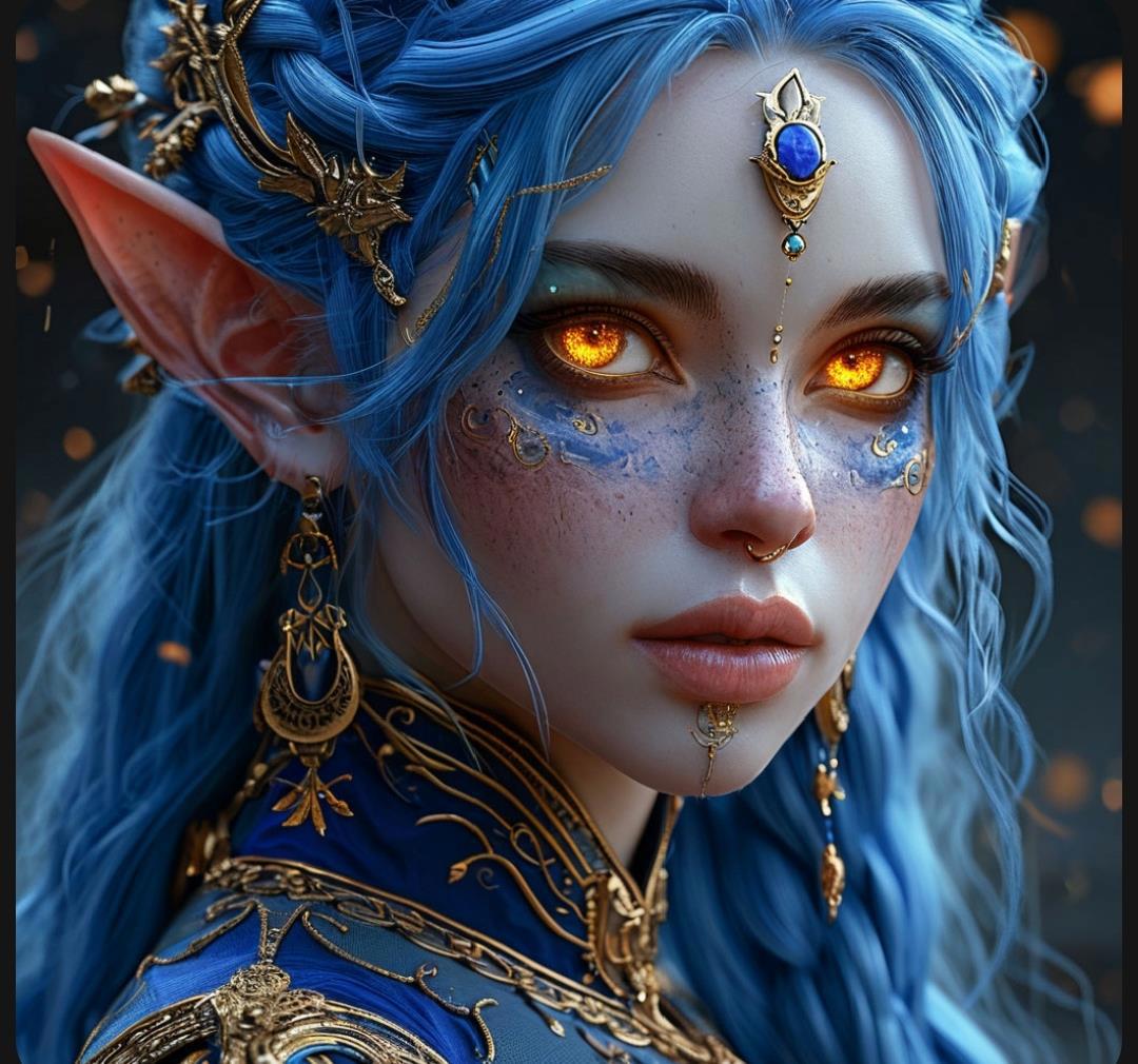 Напрягшись, мы всматривались в пространство, откуда шёл звук. Хоть убей, но было похоже на цоканье шпилек о паркет. Так и оказалось. Из глубины стеллажей к нам шла необычная девушка неописуемой красоты. Длинные синие волосы спадали по спине, как водопад, до самой поясницы. Кожа с голубоватым оттенком предавала ей ещё более экзотичный вид. Разнообразные украшения на лице и руках делали её похожей на восточную принцессу. Да и одежда выглядела как раз как у султанатской жены. Но самое притягательное в её внешности были глаза. Они светились изнутри золотом и взгляд сам стремился посмотреть в них. Кстати, шпильки тоже присутствовали. На её ногах были босоножки на длинном тонком каблуке.