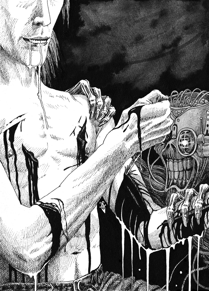 Он высвободился из футболки с эмблемой Iron Maiden и бросил её на пол. Лицо в железной маске, символ металл-группы, покрылось морщинами-складками и жутко заухмылялось. Не отводя от него взгляда, он рассёк грудь слева. Ему почудилось, что губы изображения шевелятся, и маска иронически скосила на него глаз. Он опустил взгляд на грудь и принялся смотреть, как методично режет сам себя ножом. Так же отстранённо и вместе с тем сфокусированно бреются или выдавливают прыщ. Рассекая лезвием заточки белую мягкую кожу, он пожалел, что не накачался: было бы глубже резать.