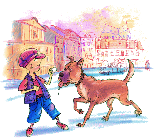На улице Лоллипоп увидел здоровую собаку. Он решил шмыгнуть на другую – бессобачью – сторону: Лоллипоп всегда делал так, завидев здоровую собаку. Но эта оказалась проворнее. Она подскочила к Лоллипопу и выхватила у него яйцо. Лоллипопа била крупная дрожь. Собаки давно и след простыл, а его всё трясло. На мизинце появился малюсенький кровоподтёк – след от клыка здоровой собаки. Когда Лоллипоп сгибал мизинец, кровоподтёк чуть увеличивался.