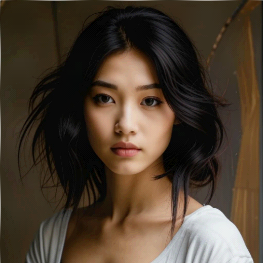 Очень чёрные волосы, цвета вороньего крыла, карие глаза, миловидный носик и красивые миндалевидные глаза. И ноги – не кривые и не короткие, что характерно для многих азиаток. Худущая, правда, и очень сильно. Это минус, но если откормить…