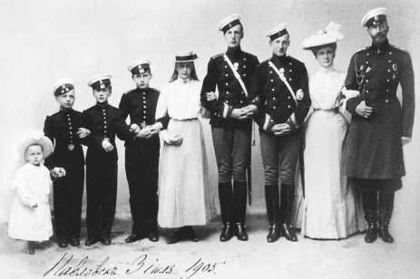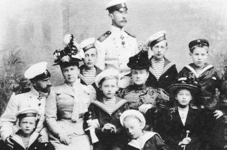 Верхний ряд: князь Гавриил, Великий князь Дмитрий Константинович, князь Иоанн, принц Христофор Греческий; средний ряд: К. Р., Великая княгиня Елизавета Маврикиевна, князь Константин, Ольга Константиновна — Королева эллинов, княжна Татьяна; нижний ряд: князь Олег, князь Игорь. 1900 г.