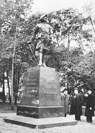 Памятник Петру I на Кирочной улице. На постаменте надпись: «Державному основателю преображенцы». Фото К. К. Буллы. Санкт-Петербург. 1910 г.