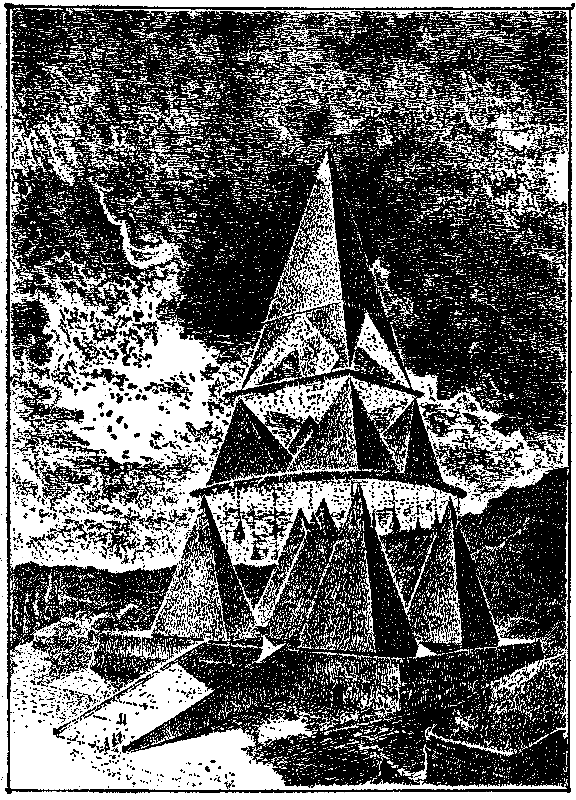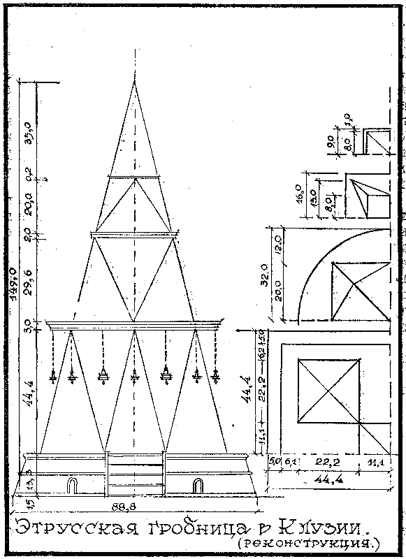 Ни Варрон, со слов которого это записано, ни Плиний не могут привести сведений о третьем этаже пирамид, потому что архитектурный замысел этрусков остается для них за семью печатями. Между тем в этом величественном надгробии сквозит та же идея изменяемости всего сущего, хотя в сооружении использованы самые простые формы. Именно этот эффект и не позволил римлянам определить высоту верхнего этажа пирамид, которые были разновеликими (что еще более усиливало иллюзию метаморфозы). Центральная пирамида верхнего этажа была высотой 74 метра (это сумма высот первого и второго этажей пирамид). Четыре боковые пирамиды создавали впечатление верхней ломаной линии, которая гармонично сочеталась с нижним архитектурным изломом у квадратного постамента. Они были меньшей высоты ее нетрудно рассчитать: 19,7 метра [1] . Уменьшающаяся от этажа к этажу высота пирамид создавала главную линию, квадратное основание и высокая средняя верхняя пирамида придавали сооружению стройность. Все вместе создавало ощущение неповторимого движения с резкими переходами от одной пирамиды к другой. Римские историки не могли понять и другого: пирамидами они называли этрусские шатры — основу многих последующих архитектурных форм.