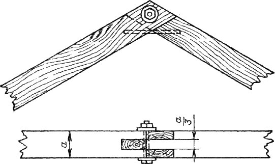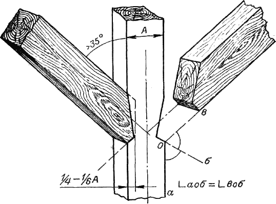 Зуб одинарный (рис. 87). Глубина трубки от 1/4 до ^1/6 толщины бруса, но не меньше 4 см. При расчерчивании врубки, тупой угол аов делится пополам, и зарубка для упирающейся части делается по равноделящей об. Если линию упора об направить под прямым углом к линии ао, откалывания части вертикального бруса. Для обеспечения врубки против боковых ударов делается зуб с шипом (рис. 88). Шип делается шириною в 1/3 ширины бруса, а глубина ему дается та же, что и глубина врубки зуба, т. е. от 1/4 до ^1/6 толщины, и, таким образом, к концу бруса шип сходит на нет.