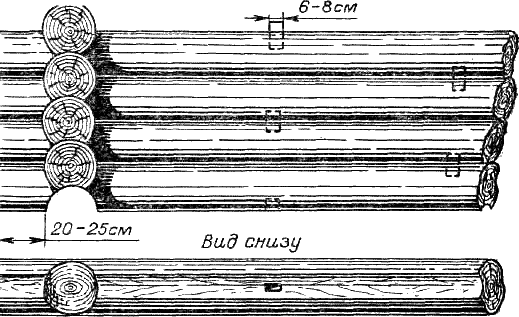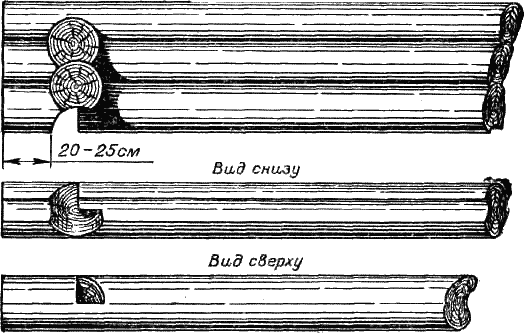 Рубка в обло (рис. 79) получается посредством выборки полукруглой впадины в каждом из бревен, причем эта выемка называется иногда чашкой, должна быть выделена в нижней части бревна, так как в противном случае, т. е. если она будет обращена кверху, в ней будет застаиваться вода, что поведет к загниванию угла.