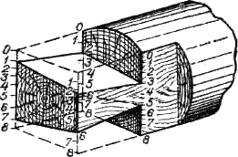Расчерчивание этой врубки делается таким образом (рис. 84): конец бревна отесывается в виде куба, вертикальные ребра которого делятся на 8 частей, и затем на двух ребрах по одной диагонали откладывают сверху и снизу по 2/8, а на двух других ребрах откладывают – на одном по 1/8 , а на другом по 3/8. Точки отложения соединяют линиями по боковым сторонам. После пропиливания и стески излишков получается фигура, ограниченная сверху и снизу двумя наклонными плоскостями, расположенными так, что ребро в 6/8 одного бруса накладывается на ребро в 2/8 у другого бруса, а часть в 4/8 накладывается на 4/8 другого бруса. В каждом совмещении в результате получается 8/8, или полная толщина ряда. При одномерных бревнах плотники упрощают работу расчерчивания, заготовляя особые шаблончики из обрезка доски.