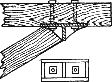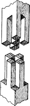 На рис. 101 – подкос врублен в подбалку при помощи чугунной подушки с закраинами, которая врезана в подбалку своими двумя приливами, заменяющими уступы шипа. Против выскакивания подкоса в стороны служат боковые стенки подушки. Все эти три врубки вполне рациональны и не очень сложны по устройству. К сожалению, далеко не всегда это можно сказать о разных врубках, предлагаемых иногда к исполнению. К числу таких врубок, кроме упоминавшегося раньше голландского замка, можно, например, отнести врубку наращивания крестообразным шипом, изображенную на рис. 102: выделка его довольно затруднительна, а прочность сомнительна из-за малых сечений отдельных элементов, не связанных между собой.