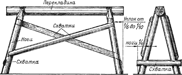 Наибольшее распространение у нас имеет четырехногий русский козел (рис. 103) из круглого леса или из брусьев. Перекладина козла делается из наиболее толстого леса, и в нее врубаются ноги, которые имеют уклон: в поперечном к перекладине направлении – в 1/4 высоты, а в продольном, – от ^1/6 до ^1/10 высоты в зависимости от возможности усилий по оси козла. Для придания ногам жесткости они связываются схватками – поперечными и крестовыми; те и другие врубаются в ноги полусковороднем (см. рис. 95). Ноги врубаются в перекладину сковороднем. Для придания ногам вышеуказанных уклонов расчерчивание перекладины производится следующим образом (рис. 104), На круглой перекладине отбиваются на обоих торцах вертикальные диаметры – Д, от концов которых откладывают в стороны: внизу по 1/3 Д, а вверху по ^1/12 Д. По полученным (а – б – в – г) точкам отбивают шнуром две продольные линии вверху и две линии внизу. По последним линиям откладывают от конца бревна 30 см (точка д),а затем – толщину ноги (точка в).