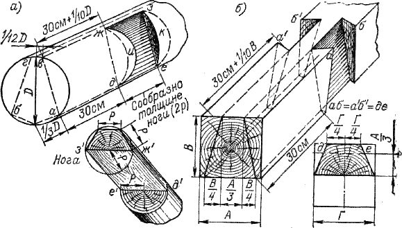 Это будут границы врубки внизу. Вверху по отбитым линиям откладывают от конца 30 см плюс от 1/4 до ^1/10 толщины перекладины (Д) для образования продольного уклона ног (точка ж). Дальше откладывают ту же толщину ноги (точка з). Наметив по окружности перекладины по отмеченным границам врубки две окружности, между ними посередине по бокам перекладины откладывают толщину наружной грани ноги (и – к) и от этих отметок делают пропилы наискось до линии жд и зе. Выколов опиленную часть перекладины, получают гнездо для ноги.