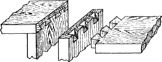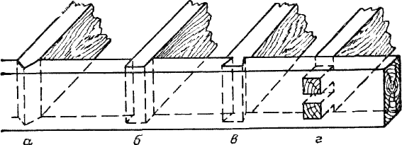 При тавровом соединении досок, т. е. когда одна из них упирается в середину другой, соединение делается одним из способов, показанных на рис. 136, т. е. или доска врезается в другую углом (а), или в прямой паз (б), или в сковородный паз (в), или же шипами (г), причем в последнем случае к этому может быть добавлен и прямой паз. Пропускаемые насквозь шипы могут быть при заклейке расклинены с торца, чем увеличивают надежность вязки и покрывают промахи в выделке шипа.