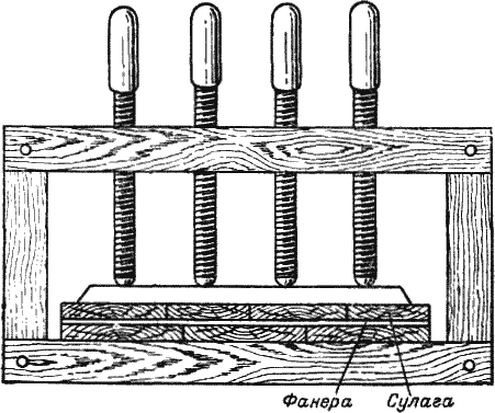 Во избежание сдвигания фанеру закрепляют несколькими тонкими шпильками. Затем для выдавливания клея сверху накладывают подогретый деревянный щит (сулагу) такой же величины и или прижимают его несколькими струбцинами (см. рис. 107), или применяют хомутовые струбцинки (рис. 137).