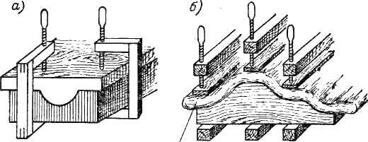 Для оклейки кривых поверхностей или применяют особые фасонные сулаги (рис. 138,а), или же накладывают особые песочные сулаги (рис. 138,б), представляющие из себя кольцевой плоский мешок, наполненный песком, который накладывают на оклеиваемую поверхность и прижимают струбцинками при помощи особых деревянных подкладок.