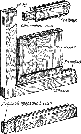 Филенчатая дверь (рис. 140) имеет обвязку, которая вяжется в углу также двойным шипом с фальцем. С внутренней стороны в обвязке выбирается паз для запускания филенки, и края обвязки обрабатываются калевкой.
