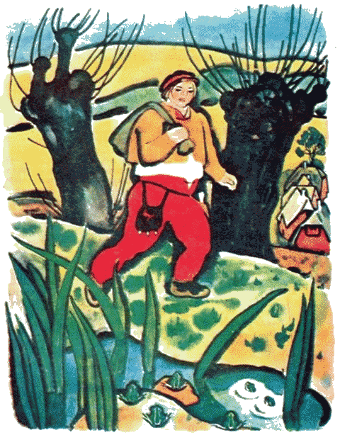 Прождал он долго, пока не наступил вечер, и ему надо было домой возвращаться, он выбранил лягушек и крикнул: