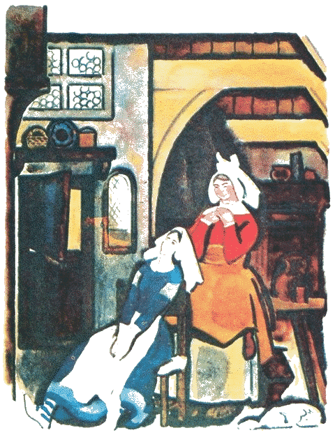 Ку-ка-ре-ку!Наша девица златая тут как тут.И вошла она прямо в дом к мачехе; и оттого что была она вся золотом покрыта, её приняли и мачеха и сводная сестра ласково.