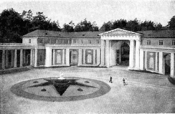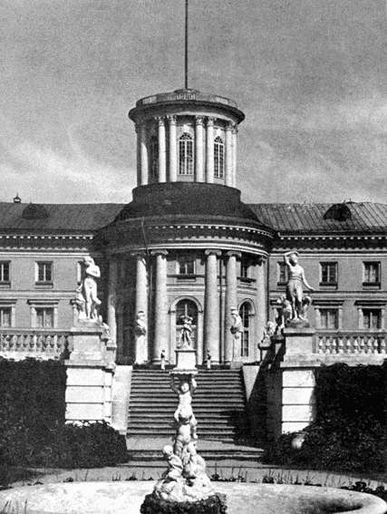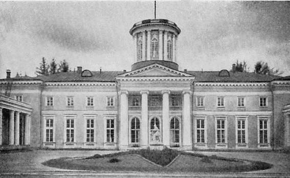 Юсуповская застава имела вид колонны со щитом, где красовалась художественно выполненная надпись: «Село Архангельское». При необходимости вглубь парка и дальше к дому можно было проехать по короткому пути, выбрав одну из двух узких обсаженных липами аллей. Так частенько поступал сам хозяин, но дамы и важные гости все же предпочитали главный путь, то есть широкую Императорскую аллею, вначале обрамленную соснами, елями и березами. С нее еще издали, высунувшись из окна кареты, нетрудно было разглядеть дворец. Собственно, с дороги взгляду открывалось не само здание, а венчавшая его изящная башенка-бельведер с высоким шпилем: главная аллея до середины поднималась в гору, поэтому все остальное можно было заметить только на спуске. Именно тогда, как и хотел князь, перед глазами внезапно вырастали дворцовые постройки, а затем, по мере приближения к цели, медленно вырисовывались очертания ворот. Массивные, торжественного вида, в верхней своей части они завершались аркой, широкий проем которой позволял видеть часть двора и восхитительный портик.