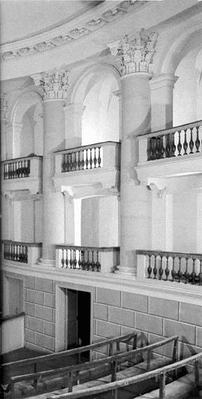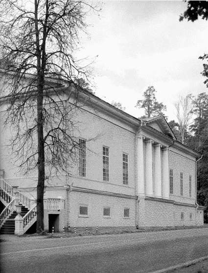 Следующей весной Гонзага закончил декорации, а вскоре для их установки в усадьбу из Москвы отправился юсуповский механик, благо строители представили князю готовое здание. Деревянное, двухэтажное, крытое на два ската, оно сохранилось до сих пор и даже почти не изменилось ни снаружи, ни внутри. Планируя фасад театра, зодчие не вышли за рамки классического стиля. Канонически строгий, с гладкими фронтонами на торцах, покрытый неяркой золотисто-белой штукатуркой, театр выглядел бы совсем скромным, если бы не имел 4 колонн с изящными ионическими капителями. Единственный вход располагался не в центре фасада, а с южной торцевой стороны, где до уровня второго этажа поднималась двухмаршевая лестница. Перед крыльцом на высоких каменных постаментах стояли 2 фонаря – устройства хотя и красивые, но вполне рациональные, ведь представления начинались поздно вечером. В интерьере, напротив, царила роскошь, правда, как и полагается театру, искусственная, исходившая не от дороговизны материалов, а от виртуозной работы художников. В распоряжении зрителей имелся просторный зал с креслами в партере и двухярусных ложах, огороженных легкими балюстрадами и разделенных между собой 12 коринфскими колоннами.