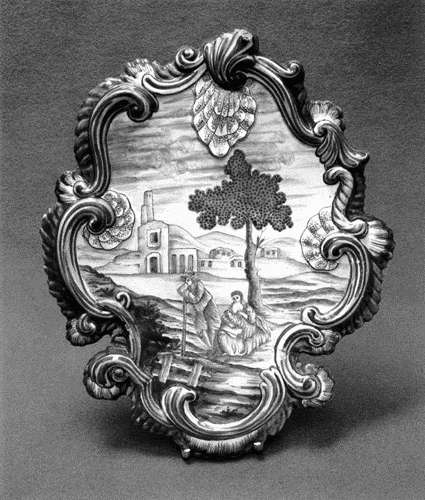Пока «живописное заведение» Юсупова благополучно существовало, процветая на росписи привозной посуды, завод Ламбера фарфора уже не выпускал, вскоре заменив тонкое и хлопотное производство фаянсом. К этому виду керамики принято относить изделия – посуду и мелкую скульптуру – из белой обожженной глины со специальными примесями, покрытые прозрачной глазурью. Имея пористый черепок и толстые стенки, такие вещи стоили недорого и, кроме того, из-за своей грубоватости считались народными. Юсуповский, точнее, ламберовский фаянс отличался на удивление широким ассортиментом. Если раньше из него делали примитивные горшки, то усадебные мастера создавали разнообразные и очаровательные вещи: те же чайные и кофейные сервизы, тарелки, солонки, ароматницы (старинный аналог современных аромаламп), компотницы, подсвечники, вазы для цветов, статуэтки. Здесь было освоено нелегкое искусство создания плакеток (от франц. plaquette – «пластинка»), которые представляли собой небольшие декоративные панно, похожие на медальоны, только не овальной, а прямоугольной формы.