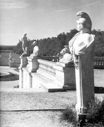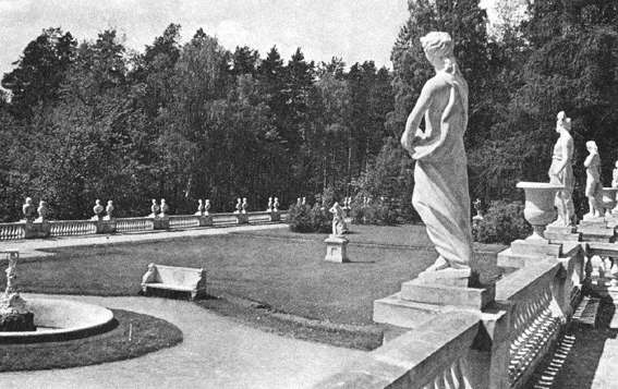 Когда-то нижняя терраса, несмотря на обилие предметов искусства, являлась местом отдыха. Намного более декоративная, чем верхняя, она была свободна от парадной строгости. Ее не ограничивала рамка высаженных в одну линию деревьев. Вместо каменных плит зеленел газон, журчал фонтан, дамы и кавалеры сидели у воды на скамьях, сделанных из мрамора, наподобие тех, которые Николай Борисович видел в Версале. Прямоугольные участки нижней террасы как-то незаметно переходили в поляны пейзажного парка, а прямые дорожки соседствовали с узкими извилистыми тропами, тянувшимися к боковым фасадам дворца. Скульптура здесь пряталась в зелени, и только беломраморная фигура «Артемиды с ланью», стоящая рядом с могучим торсом «Аполлона Бельведерского», четко выделялась на фоне кустов сирени и подобных ей по высоте крон плакучих берез. Этот уголок усадьбы, несмотря на явную регулярность, был удивительно привлекательным, лиричным и к тому же заключал в себе символику, подготавливая гостя к встрече с Большим партером – не самой обширной, зато самой интересной частью парка.