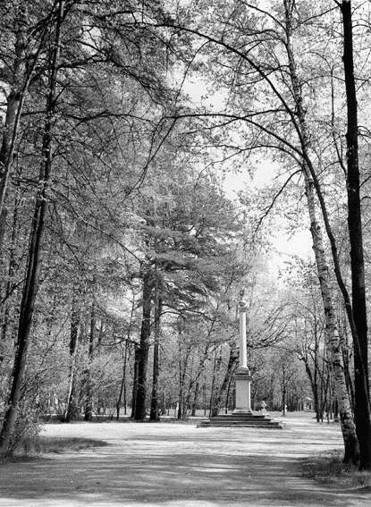 Аллея с правой стороны Большого партера открывает вход в восточную часть парка, где отсутствие архитектуры восполняет романтика настоящего русского леса. Естественная красота пейзажей в этой стороне усадьбы изредка и ненавязчиво дополняется творениями рук человеческих. Черная бронзовая статуя «Скорбь» – замечательная работа германского скульптора Барта – изображает печального юношу с лавровым венком и потухшим факелом.