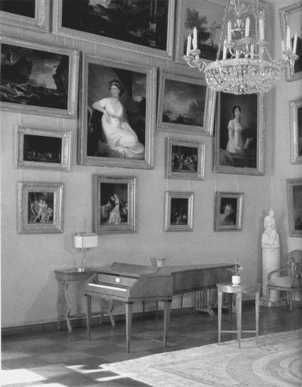 Изысканный декор комнаты дополняют статуэтки, фарфоровая ваза с ландышами, а также бронзовые каминные часы в форме античной колесницы с медальонами – изделие завода Веджвуда. Вид настольных ламп согласуется с элегантным обликом хрустальной люстры с двумя помещенными друг над другом вазами красного стекла и букетом бронзовых цветов. В большом зеркале над камином отражаются полотна французских, итальянских, германских и фламандских живописцев.
