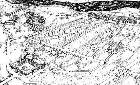Музей-усадьба «Архангельское» в 1930-х годах: церковь Михаила Архангела (1), глинобитная ограда (2), Святые ворота (3), Кладовая над оврагом (4), конторский флигель (5), Колоннада (6), домик для гостей (7), дворец (8), павильон Каприз (9), Чайный домик (10), Храм Екатерины (11), памятник Пушкину (12), памятник Минину и Пожарскому (13), беседка Розовый фонтан (14), статуя «Скоробь» (15), памятные колонны (16), театр Гонзага (17), каретный сарай (18), корпуса дома отдыха наркомата обороны (19) (рисунок художников 118)