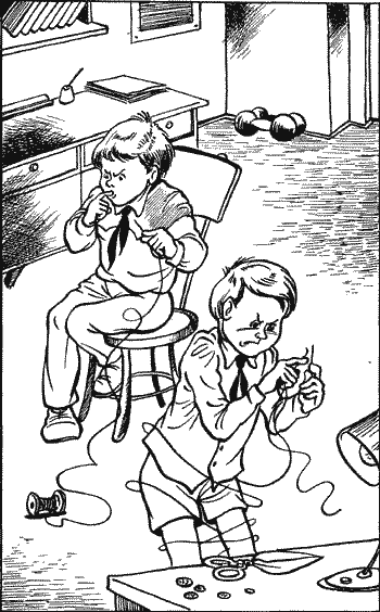 Друзья вернулись в комнату. Они решили, что Боря станет пришивать пуговицы на брюках, а Лева – к пиджаку. Но в шкатулке нашлась только одна иголка. Борис оторвал от катушки нитку и подошел к лампе, висевшей над столом. Он слюнил нитку, разглаживал ее между пальцами, задерживал дыхание, но нитка не лезла в ушко иголки. Стоя возле него, Лева советовал: