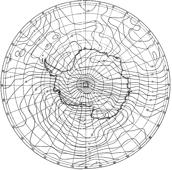 Изучение гравитационных аномалий позволяет решить, например, такую задачу: находится ли шельфовый ледник на плаву или лежит на грунте. Именно гравиметрия показала, что открытая в 1960 г. на шельфовом леднике советская антарктическая станция Лазарев расположена в опасном месте. Ледник здесь находится на плаву, и не исключена возможность катастрофы. Станция была перенесена на новое, безопасное, место и получила название Новолазаревская. Поле аномалий силы тяжести представляется обычно в виде гравиметрических карт, на которых аномалии силы тяжести показаны или непрерывными линиями, так называемыми изоаномалами, или подписями в точках наблюдений, или усредненными значениями в некоторых, стандартных по величине площадках. Генеральная гравиметрическая карта масштаба 1:5 000 000 была составлена д-ром техн. наук Н. Б. Сажиной. Трудные условия работ в Антарктиде не позволяют выполнить там сплошную, хотя бы по редкой сети, гравиметрическую съемку. Поэтому на карте остается много пустых мест – «белых пятен». Чтобы получить приблизительное представление об аномальном гравитационном поле всего континента, составлена карта средних аномалий силы тяжести (рис. 7). Большой интерес представляет также карта высот геоида в Антарктиде, характеризующая фигуру Земли для этой области. Фигура Земли представляется поверхностью, совпадающей с поверхностью воды в океанах и продолженной под континенты так, чтобы силовые линии гравитационного поля были всюду перпендикулярны к ней. Это неправильная, не математическая поверхность, и чтобы ее получить, используют эллипсоид, равновеликий по объему Земле, и от него отсчитывают высоты геоида. На рис. 8 показана карта геоида для Антарктики, построенная в 1985 г. по аномалиям силы тяжести и данным наблюдений искусственных спутников Земли (по А. Сегава).