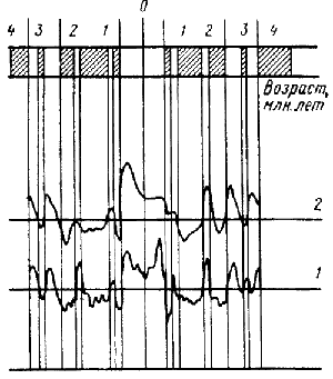 Теперь можно было сопоставить изменение интенсивности аномалий с эпохами инверсий магнитного поля. Но было сделано больше – Вайном была задана некоторая разумная гипотетическая скорость расползания дна и вычислена кривая изменения интенсивности аномалий со временем. Эта гипотетическая кривая удивительным образом совпала с кривой, составленной по фактическим возрасту и интенсивности намагниченности образцов (рис. 3). Полученное совпадение положило начало теории разрастания дна океанов, по предложению Р. Дитца названной «спредингом» (от английского to spread – раздвигаться, расширяться).