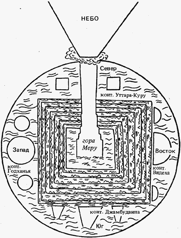 На данной карте эта поверхность имеет вид четырех континентов, расположенных в Мировом океане по странам света. С юга мы видим три треугольника, которые по своим очертаниям, естественно весьма обобщенным, напоминают Индию, Аравию и Индокитай. Центральный и самый большой из этих трех называется контитент Джамбудвипа, а остальные два – континентами-спутниками. Первоначально под Джамбудвипой индийцы имели в виду только Индию, а потом Индию с прилегающими к ней странами [334, с.80]. Потом, в связи с утратой доверия к древним традиционным сведениям, индийцы стали считать только континент Джамбудвипа реально существующим. Под ним стал пониматься весь мир, тогда как все остальные три континента с континентами-спутниками стали считаться мифическими. Так было проще и избавляло от необходимости заниматься исторической критикой.