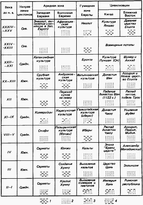 Сводная таблица изменений степени увлажненности Евразийского континента( на материале палеоэтнографии): 1 – увлажнение; 2 – усыхание; 3 – повышение увлажненности; 4 – понижение увлажненности.