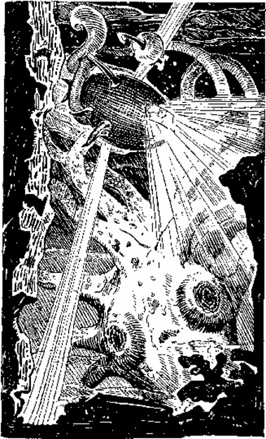 «Камбала» остановилась: ее «ласты» выгребали против течения. Прожекторы освещали те же бесконечные колонны мертвого города. И тут я увидел глаза, отразившие свет фар. Они были огромны: более пятидесяти сантиметров в диаметре! Гигантский клюв зловеще выступал между двух головных щупалец, достигавших не менее тридцати метров в длину. Восемь щупалец-«рук» были несколько короче, они неподвижно свисали с цилиндрического туловища. Большой Жак стоял, прислонившись своим десятиметровым телом к базальтовой колонне, как студент, с кажущимся безразличием ожидающий свою подругу. Из репродуктора послышались частые шипящие щелчки: ослепленный ярким светом, Жак включил свой локационный аппарат и ощупывал нас ультразвуковыми волнами. С виду же он оставался неподвижно-спокойным, только длинные щупальца протянулись к нам, как руки, чтобы заслонить глаза от нестерпимо яркого света.